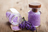 Vintage szklana butelka z aromatem lawendy sól do kąpieli (stopa moczyć). Zwieńczona lawendy kwiatów bliska. DIY zabiegi kosmetyczne i koncepcja spa. Kopiuj przestrzeń.
