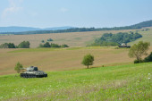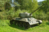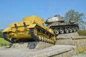 Szczegółowe spojrzenie na dwa czołgi T34 i Panzer IV, które tworzą memoria