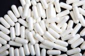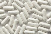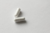 Białe przezroczyste kapsułki lub tabletki na białym tle. M