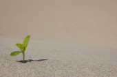 Młode sadzenie rośnie w pustynnym piasku. Koncepcja przetrwania. Zdjęcie z przestrzenią kopiowania.