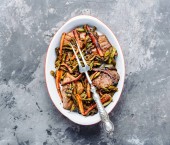 Kuchnia Azjatycka. Makaron soba z wołowiną, krewetkami i warzywami. Widok z góry.
