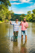 Wędkarstwo człowieka. Mężczyźni połowów w rzece w lecie. Ojciec i syn połowów. Fly Rod i kołowrotek z brązowym pstrągiem ze strumienia.