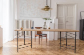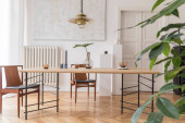 Stylowe i nowoczesne wnętrze jadalni ze stołem do wspólnego projektowania, krzesłami, złotą lampką pedantem, abstrakcyjnymi obrazami i eleganckimi akcesoriami. Tropikalne liście w wazonie. Eklektyczny wystrój. Brązowy drewniany parkiet.