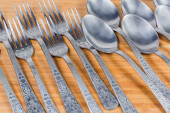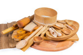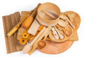 Stos różnych drewnianych przyborów kuchennych, fragment