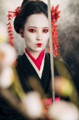 piękna gejsza w czarnym kimono z czerwonymi kwiatami w włosach Katana izolowana na czarno