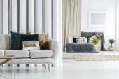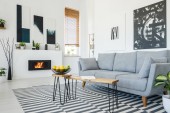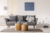 Abstrakcyjny niebieski obraz na pustej białej ścianie otwartego planu mieszkania