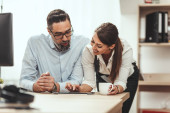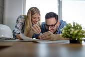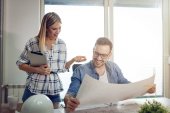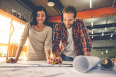 Dwaj młodzi Architekci pracujący nad nowym projektem i analizując plany w biurze