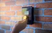 Ręka za pomocą skanowania, aby otworzyć drzwi do wejścia p domu i budynku dla systemu bezpieczeństwa