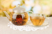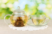 egzotyczne zielonej herbaty z kwiatami w szklany czajniczek na jasnym tle