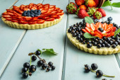 Ciasto z jagodami ciasto z truskawkami i czarne porzeczki na niebieskim rustykalnym stole.