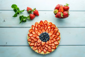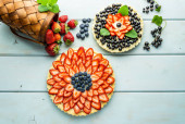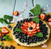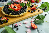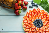 Zdjęcie "Ciasto z jagodami ciasto z truskawkami i czarne porzeczki na niebieskim rustykalnym stole." może być wykorzystywane do celów osobistych i komercyjnych zgodnie z warunkami zakupionej licencji Royalty-free. Obraz jest dostępny do pobrania w jakości wysokiej rozdzielczości do 5760x3840.