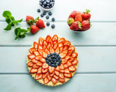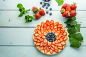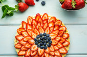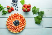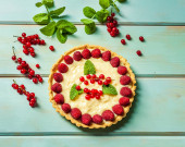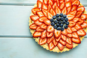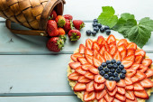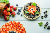 Zdjęcie "Ciasto z jagodami ciasto z truskawkami i czarne porzeczki na niebieskim rustykalnym stole." może być wykorzystywane do celów osobistych i komercyjnych zgodnie z warunkami zakupionej licencji Royalty-free. Obraz jest dostępny do pobrania w jakości wysokiej rozdzielczości do 5760x3840.