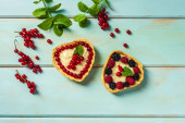 Ciasto z jagodami ciasto z truskawkami i czarne porzeczki na niebieskim rustykalnym stole.