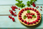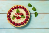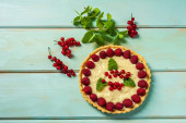 Ciasto z jagodami ciasto z truskawkami i czarne porzeczki na niebieskim rustykalnym stole.