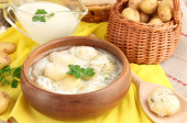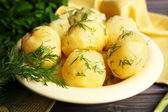 przetargu młodych ziemniaków z kwaśną śmietaną i zioła w drewniane miski na obrus z bliska