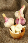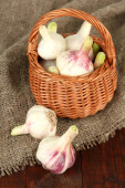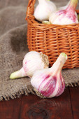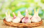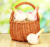 świeżego czosnku w wiklinowym koszu, na tle drewniane