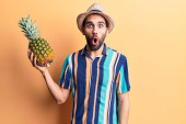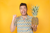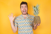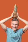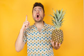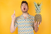 Zdjęcie "Szczęśliwy człowiek z ananasem na kolorowym tle" może być wykorzystywane do celów osobistych i komercyjnych zgodnie z warunkami zakupionej licencji Royalty-free. Obraz jest dostępny do pobrania w jakości wysokiej rozdzielczości do 5760x3840.