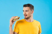 Zdjęcie "Człowiek z Burger na tle kolorów" może być wykorzystywane do celów osobistych i komercyjnych zgodnie z warunkami zakupionej licencji Royalty-free. Obraz jest dostępny do pobrania w jakości wysokiej rozdzielczości do 5760x3840.