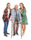 Młody opiekun z starszy kobieta i jej wnuk na białe tło