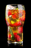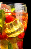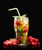 mrożoną herbatę z malinami i mięta na czarnym tle