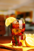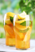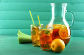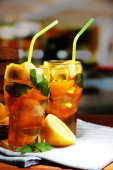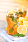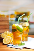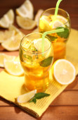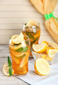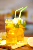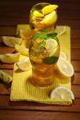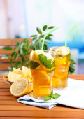 mrożona herbata z cytryna i mięta na drewnianym stole, na zewnątrz