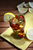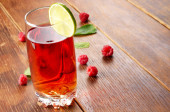 mrożoną herbatę z malinami i mięta na drewnianym stole, na zewnątrz