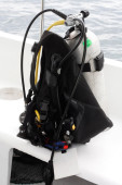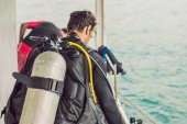 Przejdź nurkowania scuba nurek obsługi zbiornika i regulator na outrigger canoe
