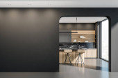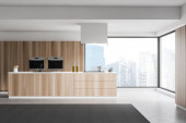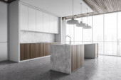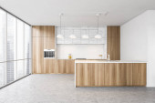 Zdjęcie "Panoramiczna kuchnia z drewnianą wyspą" może być wykorzystywane do celów osobistych i komercyjnych zgodnie z warunkami zakupionej licencji Royalty-free. Obraz jest dostępny do pobrania w jakości wysokiej rozdzielczości do 5760x3840.