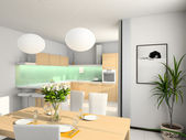 Wnętrze kuchni białego i drewnianego, licznik i stół