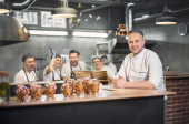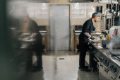 gotować stoi z tyłu, gotowanie w nowoczesnej kuchni, w restauracji. niski przycisk. Kopiuj miejsce dla tekstu
