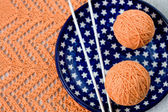 dwie kule różowy przędzy i iglice na płytce niebieski