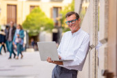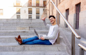 Zdjęcie "Atrakcyjne modny młodzieniec w ubranie studia pracy na laptopie w Internecie, blogów, na czacie i sprawdzanie poczty na kroki europejskie miasto. Student nauki online i stylu życia." może być wykorzystywane do celów osobistych i komercyjnych zgodnie z warunkami zakupionej licencji Royalty-free. Obraz jest dostępny do pobrania w jakości wysokiej rozdzielczości do 5760x3840.