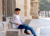 Atrakcyjne modny młodzieniec w ubranie studia pracy na laptopie w Internecie, blogów, na czacie i sprawdzanie poczty na kroki europejskie miasto. Student nauki online i stylu życia.