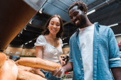 szczęśliwy Asian kobieta dotykając chleba stojąc w pobliżu African American Man z ręką w kieszeni w supermarkecie