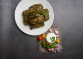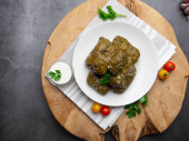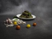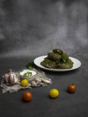 Pyszne Sarma Dolma nadziewane liście winogron ryżu, Sos biały jogurt. Libańska Dolma Sarma na talerzu