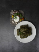 Zdjęcie "Pyszne Sarma Dolma nadziewane liście winogron ryżu, Sos biały jogurt. Libańska Dolma Sarma na talerzu" może być wykorzystywane do celów osobistych i komercyjnych zgodnie z warunkami zakupionej licencji Royalty-free. Obraz jest dostępny do pobrania w jakości wysokiej rozdzielczości do 5760x3840.