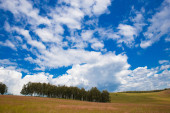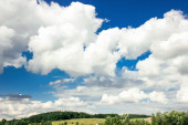 Zdjęcie "Błękitne niebo z białymi chmurami, drzewami, polami i łąkami z zieloną trawą, przeciw górach. Skład natury. Wiejski krajobraz letni." może być wykorzystywane do celów osobistych i komercyjnych zgodnie z warunkami zakupionej licencji Royalty-free. Obraz jest dostępny do pobrania w jakości wysokiej rozdzielczości do 5760x3840.