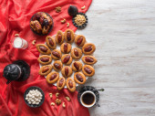 Kolaż arabskiego mięsa przekąskę kibbeh. Tradycyjny arabski kibbeh z jagnięciny i sosny orzechy.