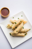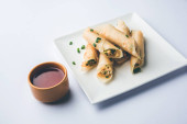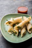 Paneer cygaro chilli są chrupiące rolki nadziewane Paneer, który jest ciekawym rozrusznikiem dla każdej partii. podawany z ketchupem pomidorowym. Selektywna koncentracja