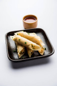 Paneer cygaro chilli są chrupiące rolki nadziewane Paneer, który jest ciekawym rozrusznikiem dla każdej partii. podawany z ketchupem pomidorowym. Selektywna koncentracja