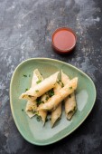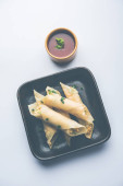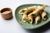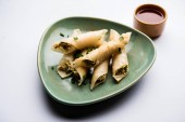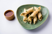 Paneer cygaro chilli są chrupiące rolki nadziewane Paneer, który jest ciekawym rozrusznikiem dla każdej partii. podawany z ketchupem pomidorowym. Selektywna koncentracja