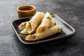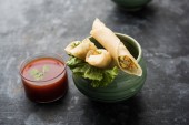 Zdjęcie "Paneer cygaro chilli są chrupiące rolki nadziewane Paneer, który jest ciekawym rozrusznikiem dla każdej partii. podawany z ketchupem pomidorowym. Selektywna koncentracja" może być wykorzystywane do celów osobistych i komercyjnych zgodnie z warunkami zakupionej licencji Royalty-free. Obraz jest dostępny do pobrania w jakości wysokiej rozdzielczości do 5760x3840.