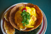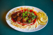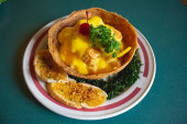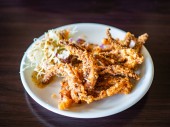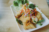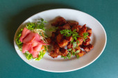 Głęboko smażone wieprzowina trzy duże soja sos z warzywami na białych d