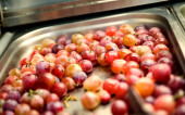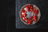 Stół z dwoma pustymi kubkami i sztucznymi jagodami w płytce