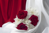 układ z kwiatów i pudełka na cukierki