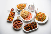 Różne Indo chińskich potraw w grupie obejmuje Schezwan/Szechuan Hakka Noodles, VEG smażony ryż, VEG Manchurian, American CHOP SUEY, chilli Paneer, chrupiące zupa warzywna i warzywna