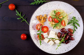 Zdrowe tosty z awokado na śniadanie lub lunch, awokado guacamole, oliwki Kalamata, pomidory, orzechy nerkowca i ser feta. Kanapki wegetariańskie. Widok z góry
