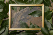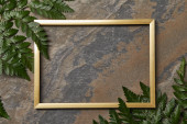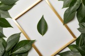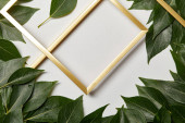 Widok z góry pustych złotych ramek na białym tle z kopią przestrzeni i liści paproci