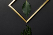 Widok z góry puste złote ramki w pobliżu zielonych liści na czarnym tle z kopią przestrzeni