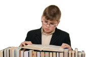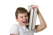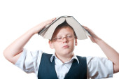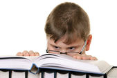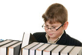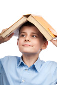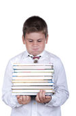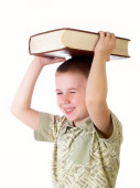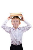 szczęśliwy chłopiec posiada kilka książek na głowę